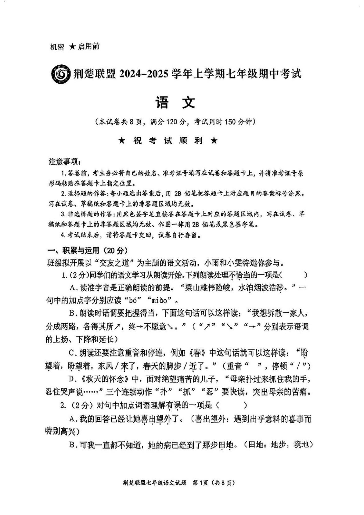 - 1 【免费】湖北省荆楚联盟2024-2025学年七上期中全科试题(PDF版含答案)
